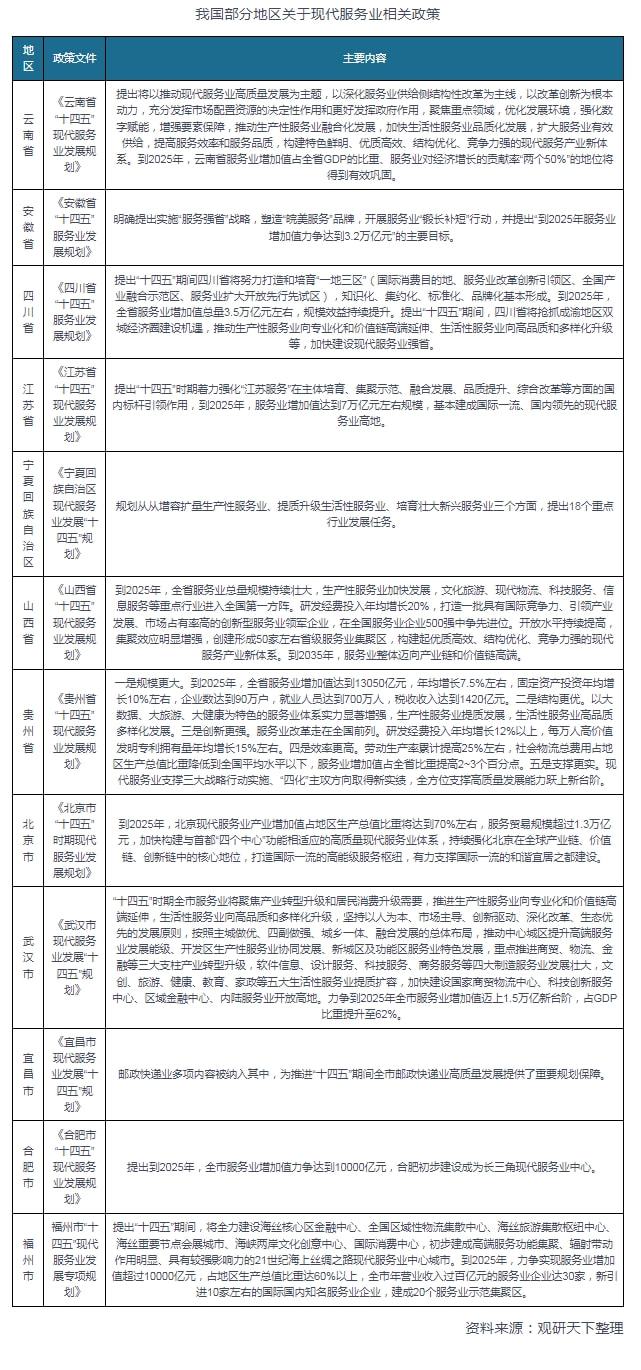 地方層面上,例如云南省發(fā)布的《云南省“十四五”現(xiàn)代服務業(yè)發(fā)展規(guī)劃》,提出將以推動現(xiàn)代服務業(yè)高質量發(fā)展為主題,以深化服務業(yè)供給側結構性改革為主線,以改革創(chuàng)新為根本動力,充分發(fā)揮市場配置資源的決定性作用和更好發(fā)揮政府作用,聚焦重點領域,優(yōu)化發(fā)展環(huán)境,強化數(shù)字賦能,增強要素保障,推動生產性服務業(yè)融合化發(fā)展,加快生活性服務業(yè)品質化發(fā)展,擴大服務業(yè)有效供給,提高服務效率和服務品質,構建特色鮮明、優(yōu)質高效、結構優(yōu)化、競爭力強的現(xiàn)代服務產業(yè)新體系。到2025年,云南省服務業(yè)增加值占全省GDP的比重、服務業(yè)對經濟增長的貢獻率“兩個50%”的地位將得到有效鞏固。