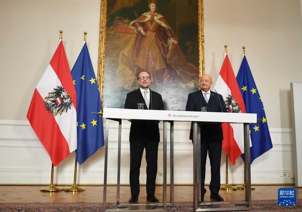 3月3日,在奧地利維也納,奧地利看守政府總理沙倫貝格(左)在總理府和奧地利人民黨黨首克里斯蒂安·施托克爾進(jìn)行權(quán)力交接。