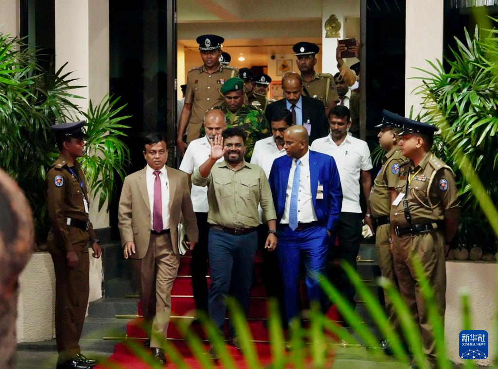 ? 9月22日,在斯里蘭卡首都科倫坡,迪薩納亞克(中)確認(rèn)勝選后走出選舉委員會(huì)。